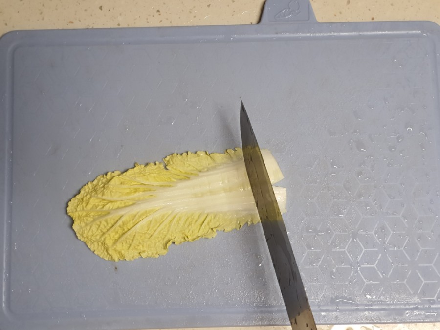 배추는 밑동을 자르고 겉에 시든 잎사귀는 뜯어 버리고 ,