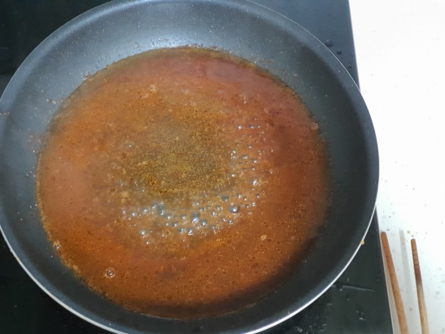 준비한 분량의 물을 제외한 소스를 팬에 넣고
